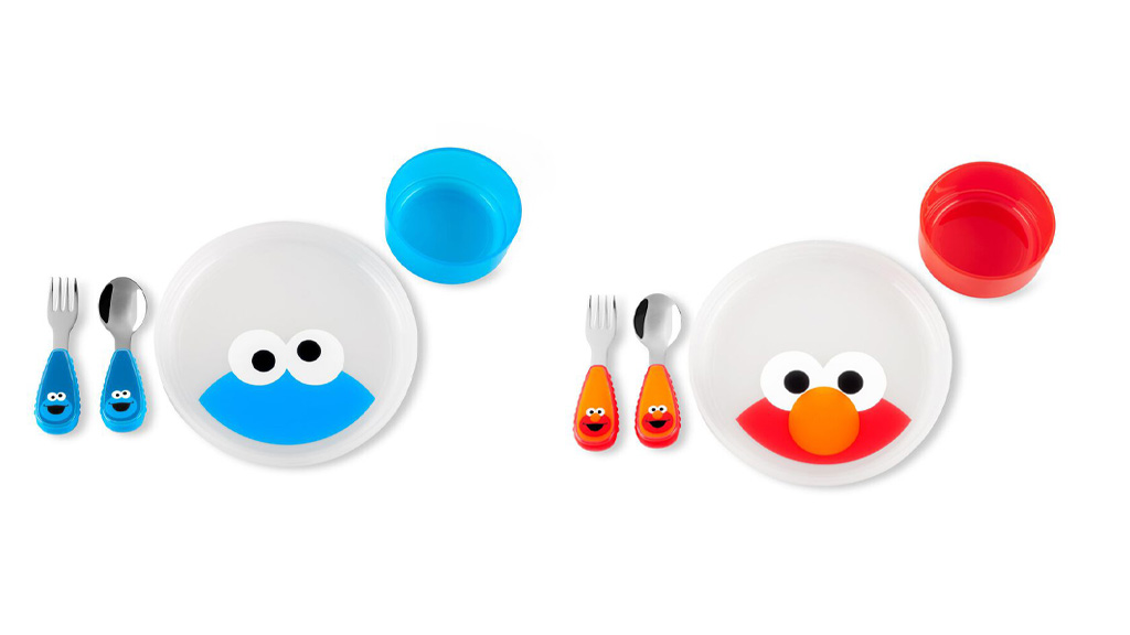 Cănițele pentru gustări fără BPA au mânere ușor de prins, capac care se fixează pentru a menține mâncarea proaspătă, deschidere anti-picurare și au o capacitate de 7,5 uncii. Sunt disponibile în trei modele: Elmo, Cookie Monster și Abby Cadabby.Fiecare set de masă conține o farfurie, un bol, o furculiță și o lingură. Farfuria și bolul **pot fi folosite în cuptorul cu microunde** și au o bază **antiderapantă**. Furculița și lingura din oțel inoxidabil au margini **ușor de prins**. Seturile **fără BPA și PVC** sunt disponibile în designurile **Cookie Monster** și **Elmo**.