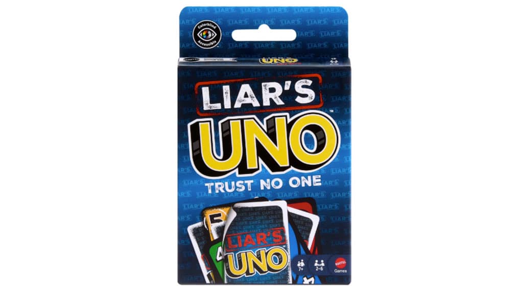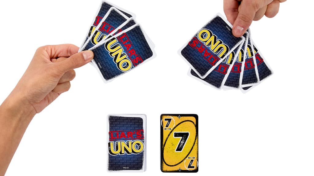 În jocul Mattel UNO, minciuna nu este înșelăciune, ci face parte din joc! În această ediție de UNO, pot concura între 2 și 6 jucători, de la vârsta de 7 ani în sus, pentru a descoperi cine spune adevărul și cine blufează. Fiecărei cărți numerotate tradiționale îi corespunde și o carte Liar, care poate fi recunoscută după culoarea sa de bază neagră. Cartea Liar trebuie jucată cu fața în jos, iar jucătorul care o trage trebuie să anunțe cu încredere numărul cărții. Dacă este prins că a mințit, trebuie să tragă o nouă carte. Însă dacă a spus adevărul, acuzatorul trebuie să tragă o carte. Jucătorii încearcă să câștige prin înșelăciune, dar o regulă rămâne neschimbată: când cineva rămâne cu o singură carte în mână, trebuie să strige: UNO!