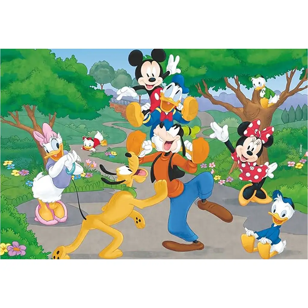 Descoperă lumea lui Mickey Mouse și a prietenilor săi cu acest puzzle maxi colorat, cu două fețe, care conține două imagini separate de câte 12 piese și două planșe de colorat vesele! Puzzle-urile, datorită dimensiunilor lor de 50×35 cm, sunt spectaculoase și ușor de asamblat chiar și pentru cele mai mici mânuțe. Pe imagini apar Mickey, Minnie, Donald, Daisy, Goofy și Pluto, înfățișați plimbându-se într-o zi însorită sau în mijlocul unor aventuri jucăușe – plini de energie și bună dispoziție.