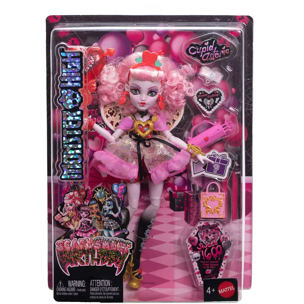 Cupid Asteria se remarcă imediat prin aspectul ei deosebit: părul roz creț, coroana în formă de inimă și rochia detaliată, în nuanțe de auriu și roz, amintesc de o prințesă „monstruos” cool. Rochia este decorată cu motive de inimă, straturi de tul strălucitor și detalii aurii, în timp ce aripile elegante, decupate de pe spate, îi completează aspectul magic. Accesoriile incluse – balon în formă de inimă, pungă cadou, cercei și brățară – sporesc și mai mult atmosfera festivă.