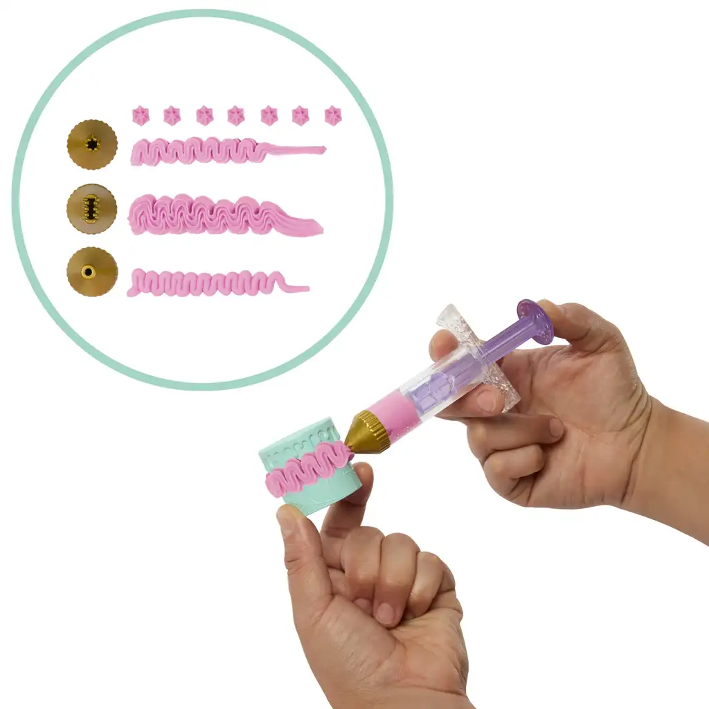 Setul conține peste 20 de ustensile și accesorii pentru decorarea torturilor, cu ajutorul cărora copiii pot crea iar și iar. Cele 6 torturi suprapuse, cele 6 mini brioșe, tava pentru prăjituri, sucitorul, spatula, penseta și diferitele instrumente de modelat fac ca experiența decorării să fie completă.