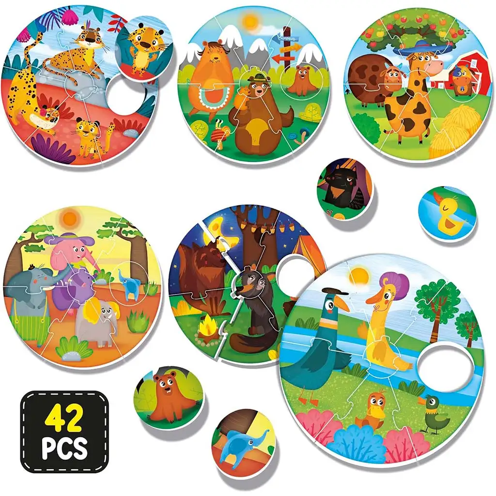 - 6 puzzle-uri circulare separate cu familii de animale