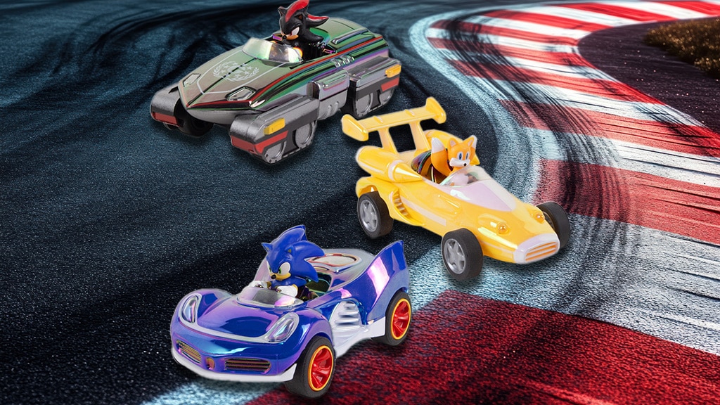 Copiii pot porni motoarele și se pot aventura în noi aventuri pline de joc cu cele mai noi mașini de curse. Acest set de trei piese include pe Sonic, Shadow și Tails, care stau la volanul unor mașini de curse all-stars unice, tematice. Setul ediție specială are o vopsea irizată, futuristă, care își schimbă culoarea în funcție de lumină și unghi. Copiii își pot face personajele preferate să concureze până la linia de sosire, deoarece vehiculele sunt echipate cu motor cu arc încorporat și anvelope aderente, făcând jocul și mai palpitant. Acest set este alegerea perfectă pentru orice fan Sonic care iubește viteza și aventura!