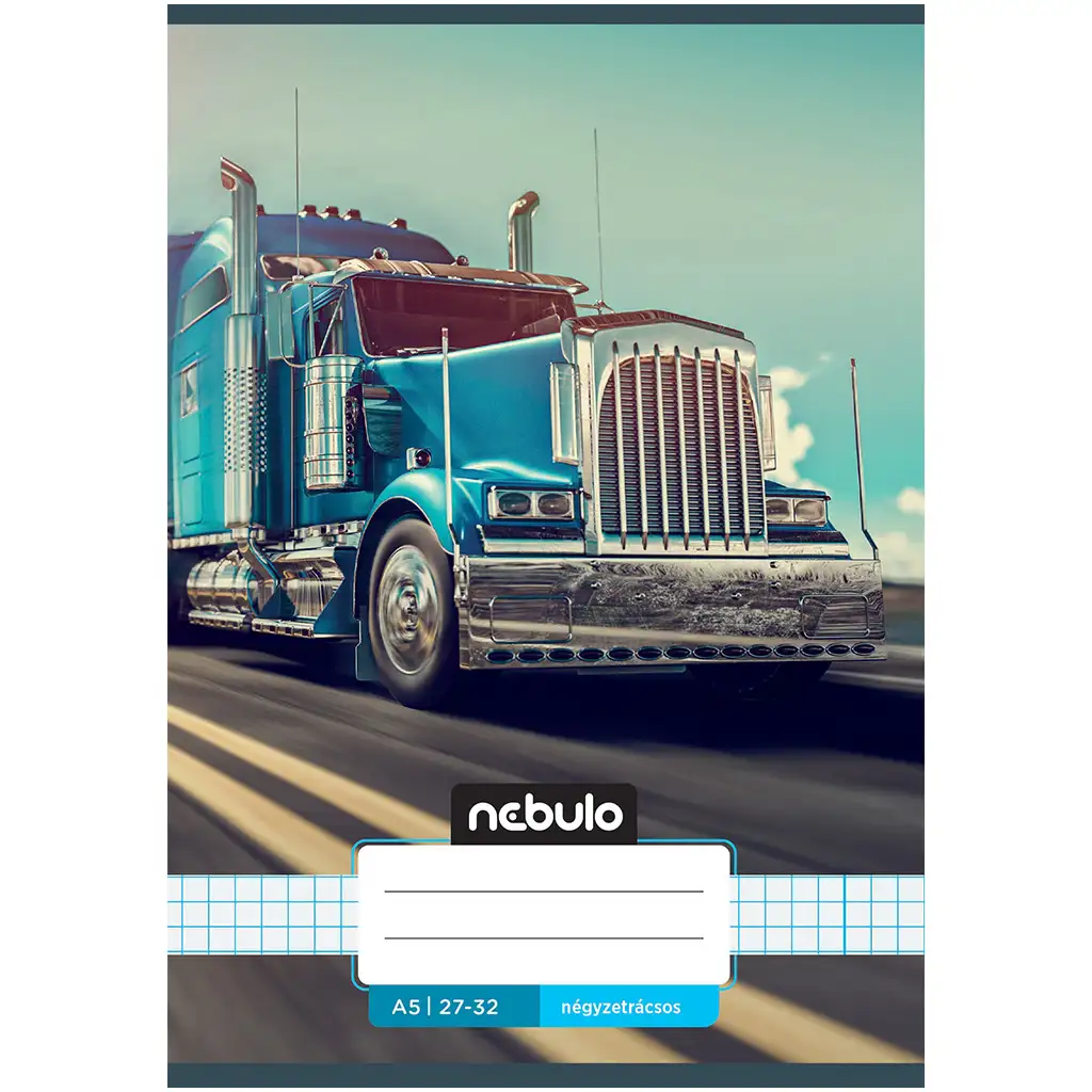 Nebulo: Caiet cu pătrățele, format A/5, 27-32, cu model de camion imprimat.