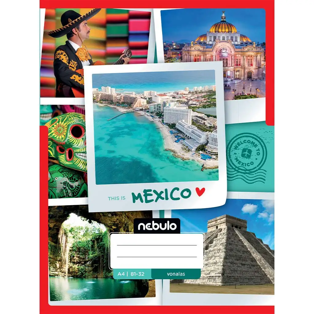 Caietul liniat cu model Mexic, format A/4, 81-32, este o adevărată experiență pentru orice copil dornic de aventură! Acest caiet nu este potrivit doar pentru temele școlare, ci și pentru a-ți lăsa imaginația să călătorească în timpul învățării – direct în lumea vibrantă și colorată a Mexicului. Pe copertă se regăsesc plaja fabuloasă din Cancun, celebra piramidă Chichén Itzá, cenote misterioase, măști colorate de Ziua Morților, un muzician mariachi și peisaje urbane fascinante, de parcă ai ține în mână paginile unui jurnal de călătorie.