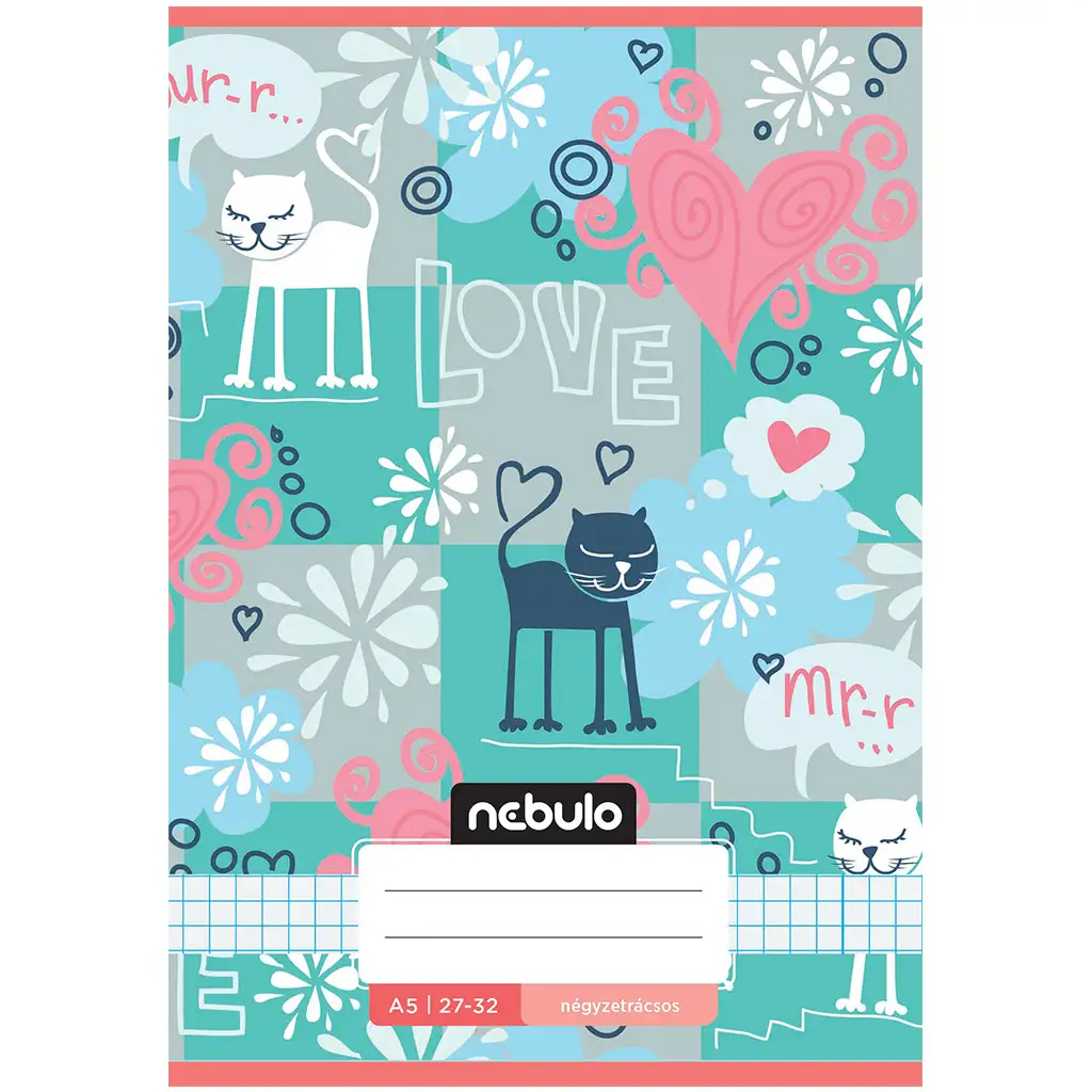 Caietul cu pătrățele Nebulo Mirr-Murr este o alegere cu adevărat călduroasă pentru orice elev iubitor de pisici! Coperta este decorată cu pisicuțe jucăușe, stilizate, care zâmbesc liniștite printre inimioare și flori. Culorile blânde – mentă, corai, albastru deschis și roz – creează un efect armonios, plăcut, astfel încât și învățatul să devină mai vesel.