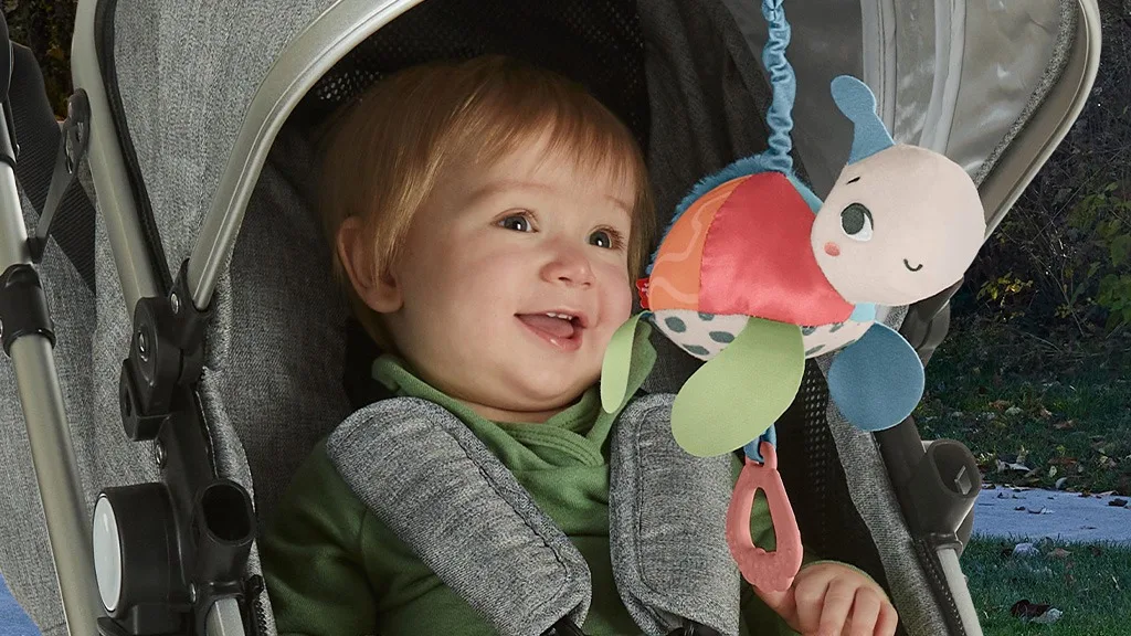 Copiii pot sări pe această broască țestoasă de pluș pentru a o face să sari și să zornăie. Plușul are o zornăitoare fără BPA, se poate atașa ușor de cărucioare și este fabricat din 80% plastic reciclat.Această broască țestoasă zornăitoare captează atenția bebelușilor cu mânerul său trăgător și eliberator și cu marginea sa de ros în formă de scoică. Jucăria poate fi ușor atașată la cărucioare, genți de scutece și alte obiecte, fiind astfel pregătită pentru distracție în deplasare.
