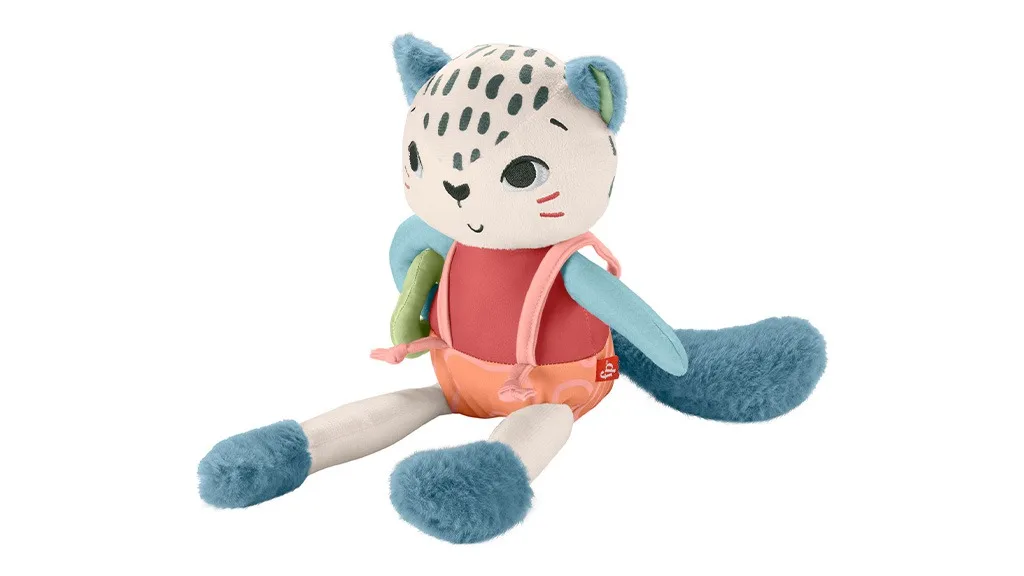 Acest leopard de pluș colorat are cizme care scârțâie, picioare detașabile, o curea de umăr detașabilă și un inel de tracțiune. Jucăria este fabricată în proporție de 95% din plastic reciclat și este lavabilă în mașina de spălat.Spotting Fun Snow Leopard este plin de activități pentru cei mici. Copiii pot trage de picioare, pot face zgomote cu labele și pot simți materialele moi, mătăsoase.