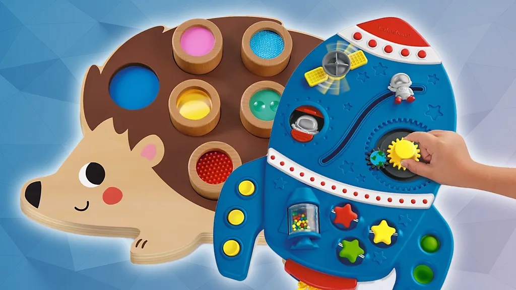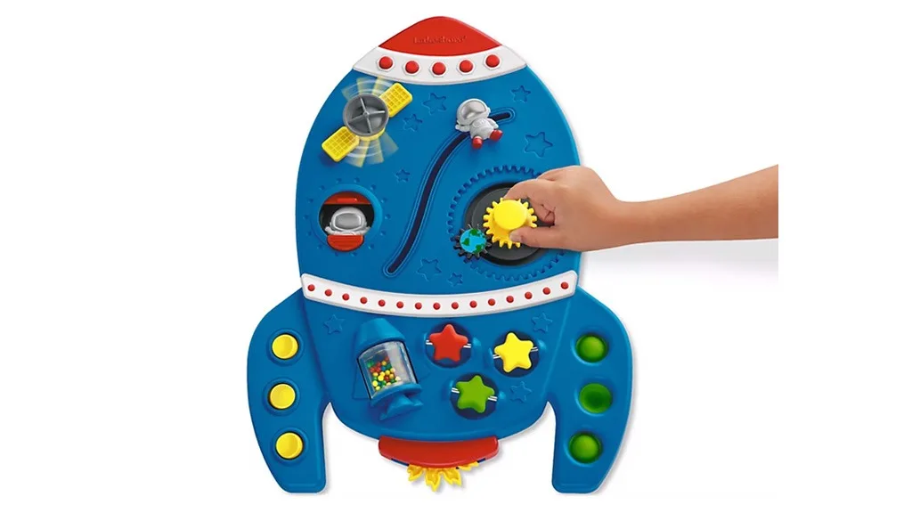 Această placă cu formă de rachetă oferă o colecție completă de experiențe senzoriale pe temă spațială. Pe placă se găsește un tobogan de astronaut, un satelit rotitor și multe alte elemente.O tablă de fidget "Din altă lume" îi fascinează pe copiii între 3-6 ani cu o lume plină de jocuri senzoriale. Tabla în formă de rachetă are numeroase accesorii atașate, conținând tot felul de lucruri, de la un tobogan de astronaut până la un satelit rotitor.