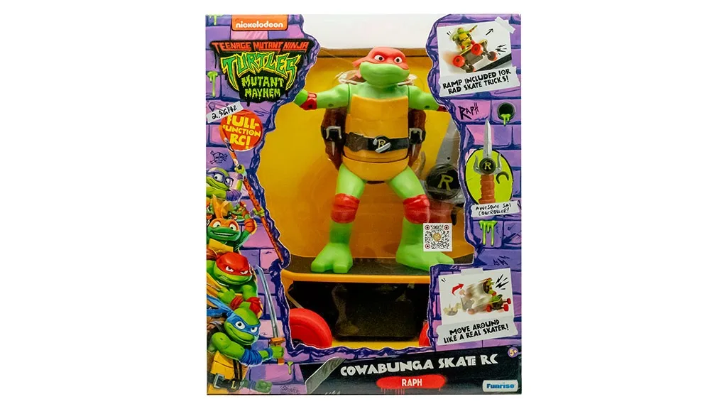 Noul TMNT Cowabunga Skate RC este acum disponibil la numeroși retaileri, în rate și online. Funrise încurajează fanii să posteze pe rețelele sociale cu hashtagul #CowabungaSkateRC și să își arate noua jucărie preferată!Această placă de skateboard cu telecomandă de 2.4 GHz prezintă personajul TMNT (Teenage Mutant Ninja Turtles), Raphael. Placa poate să se miște lateral, să avanseze și să meargă înapoi, și de asemenea poate să se rotească, astfel încât dacă cade, să se poată ridica din nou. Pachetul include o rampă pentru skateboard și un controler de telecomandă în formă de Sai.