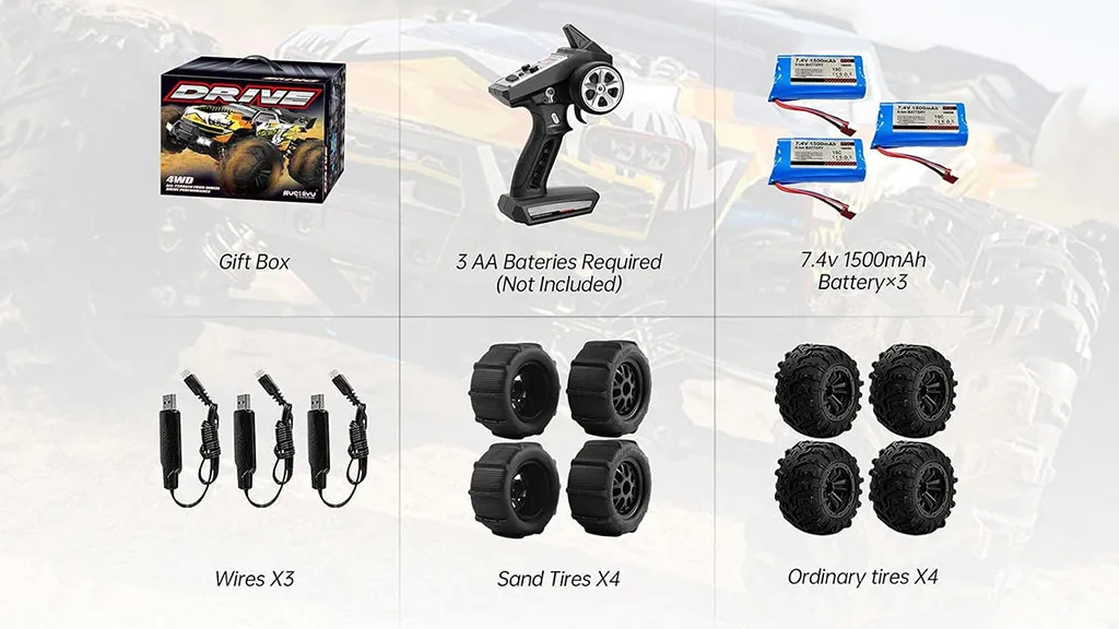 Acest camion R/C cu tracțiune integrală la scară 1:16 este proiectat să navigheze cu ușurință pe teren accidentat și poate derapa, roti și sări. Motorul fără perii accelerează până la o viteză maximă de 47 mph. Dispune de un controler de tip trăgaci de 2.4 GHz și vine cu anvelope de tip nisip, care pot fi folosite și pe zăpadă. Vine cu trei baterii și trei încărcătoare, permițând camionului să funcționeze până la o oră (20 de minute per baterie). Printre accesorii se numără un mini-șurubelniță, o cheie franceză și piese suplimentare.