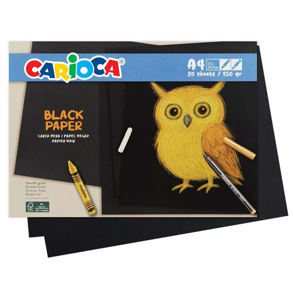 Pachetul de coli negre A4 Carioca este alegerea perfectă dacă dorești ca creațiile creative ale copilului tău să fie și mai spectaculoase. Fundalul negru conferă un aspect special fiecărui desen, astfel culorile deschise, creta sau pixurile cu gel se evidențiază foarte viu pe el. Ideal pentru activități creative, proiecte acasă sau chiar teme școlare.