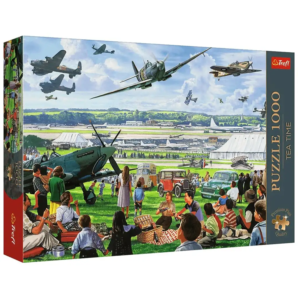 Întoarceți-vă în timp într-o epocă în care zborul era încă o adevărată minune! Puzzle-ul de 1000 de piese „Paradă aeriană – Zi nostaligică a aviației”, parte din seria Tea Time, surprinde o scenă plină de nostalgie: familii care fac picnic, mașini de epocă și avioane clasice impresionante la un spectacol aerian. În fundal se întrevăd hangare și piste, iar pe cer, aparate de război legendare taie norii. O adevărată călătorie în timp pentru iubitorii aviației – atât copii, cât și adulți.