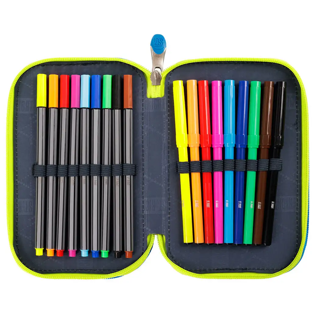 Penarul are trei compartimente separate cu fermoar, care oferă suficient spațiu pentru toate instrumentele școlare necesare. Mânerele ergonomice și durabile ale fermoarelor și materialele rezistente asigură că penarul va servi micuțului proprietar pentru o perioadă lungă de timp. Compartimentele practice și punctele de fixare permit organizarea și accesul ușor la toate instrumentele.