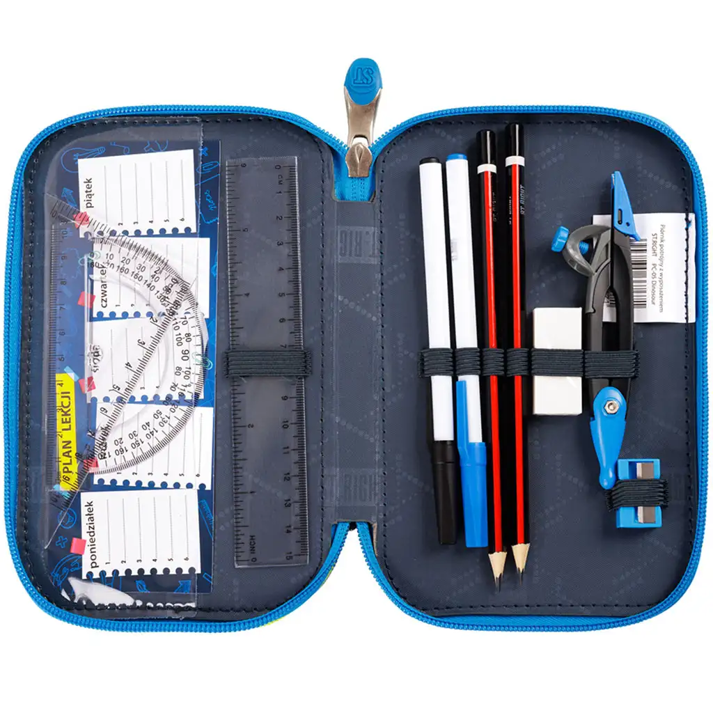 - Conținut: 18 creioane colorate, 9 carioci colorate, 9 finelinere colorate, riglă de 15 cm, radieră, ascuțitoare, orar, 2 pixuri (albastru și negru), raportor, echer, 2 creioane grafit, compas