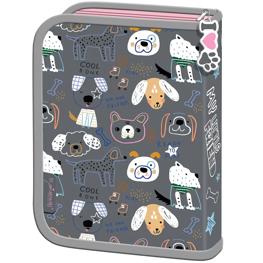 Penarul pliabil cu câini My Little Friend este alegerea perfectă pentru orice mic iubitor de animale care adoră cățeii! Pe una dintre fețele penarului zâmbește un adorabil cățeluș Pomeranian pe un fundal roz, decorat cu inimioare și grafice vesele, în timp ce pe cealaltă față modele jucăușe cu căței și inscripții amuzante (de exemplu, „Ready to play”, „Cool bone”) îi conferă un aspect și mai vesel. Combinația de culori gri și roz oferă un aspect la modă și prietenos, pe care copilul tău îl va purta cu plăcere la școală.