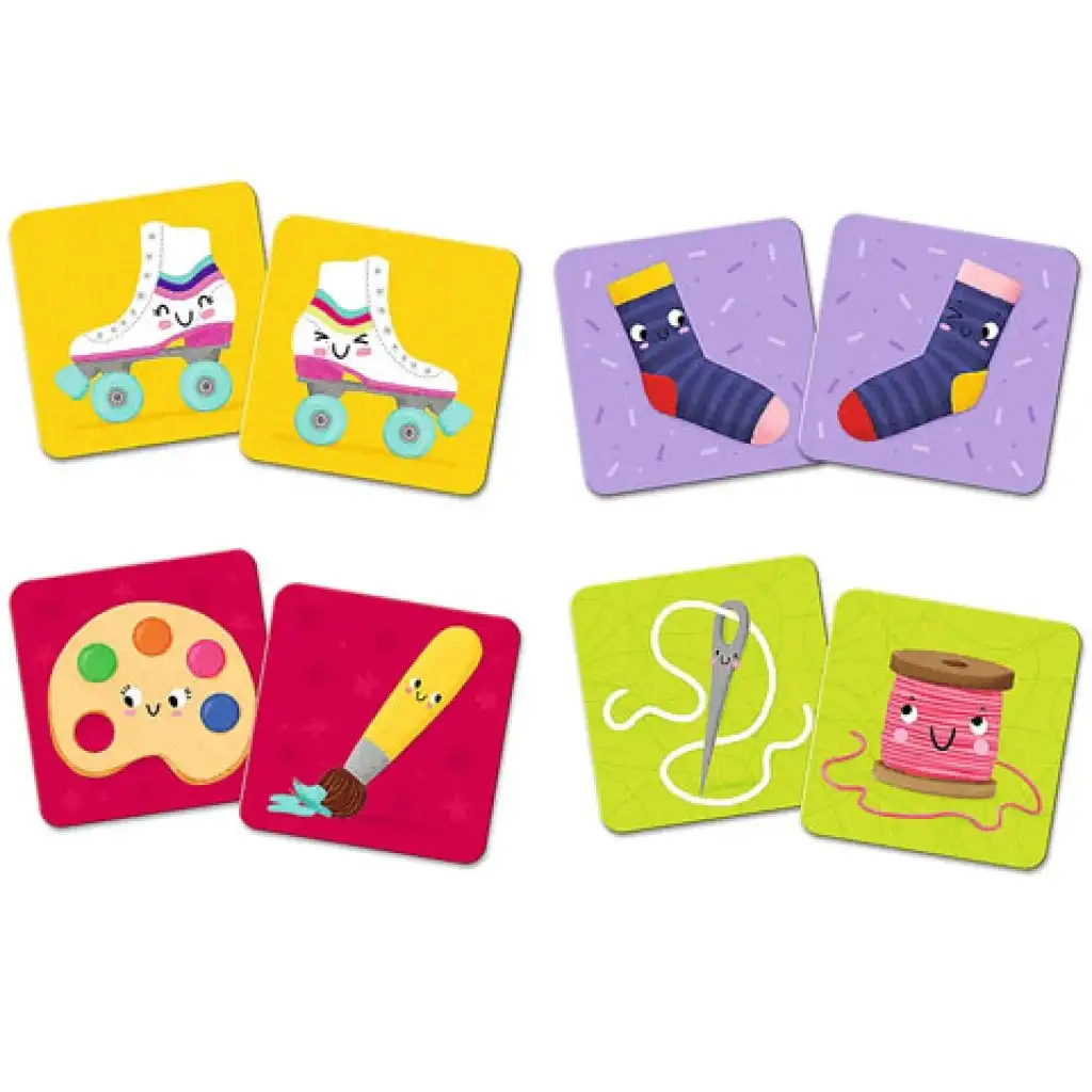 Acest joc de memorie nu se bazează pe perechi identice, ci pe asocierea plăcuțelor corespunzătoare, astfel încât ascuțitoarea nu are ca pereche o altă ascuțitoare, ci creioane colorate, la fel cum acul are ca pereche potrivită ața, astfel încât cei mici trebuie să fie și mai atenți. Nu trebuie decât să amestecați bine plăcuțele cu imaginea în jos, care sunt frumos aranjate pe masă. Apoi, jucătorul de început întoarce două cărți și toată lumea își amintește ce era pe imagine înainte ca acestea să fie întoarse înapoi. Apoi urmează rândul următorului jucător. Dacă un jucător reușește să găsească o pereche de imagini, o primește și poate încerca din nou. Câștigătorul va fi cel care la final va avea cele mai multe perechi de imagini în colecția sa.