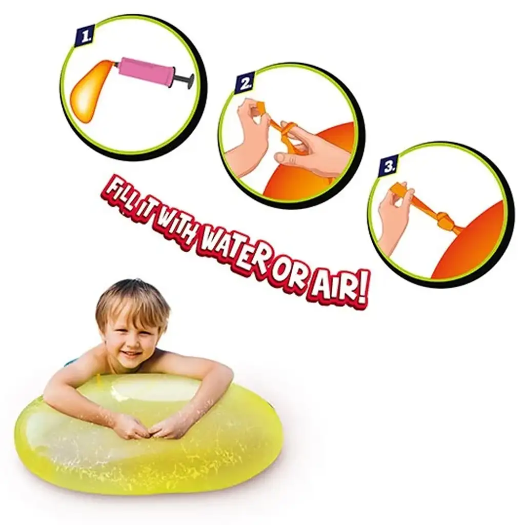 Dacă o umpleți cu apă, devine o minge uriașă, moale și elastică, pe care se poate sta, sări sau rostogoli. Umflată cu aer, poate fi folosită ca o minge uriașă și ușoară, pe care o puteți arunca, rostogoli și sări. Datorită materialului elastic și durabil, vă puteți bucura de joc pentru mult timp.