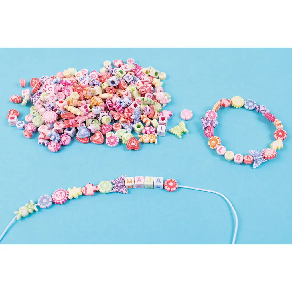 Fă ca activitățile creative să fie și mai magice cu acest set PlayBox cu 350 de mărgele model, care conține modele de poveste și mărgele cu litere colorate! Copiii își pot crea propriile brățări sau coliere personalizate în doar câteva clipe, lucrând cu forme precum fluturi, soare, flori, iepurași, inimi și figurine simpatice de animale. Fiecare piesă din set are culori pastelate delicate, astfel încât bijuteriile create să fie cu adevărat drăguțe și personale.