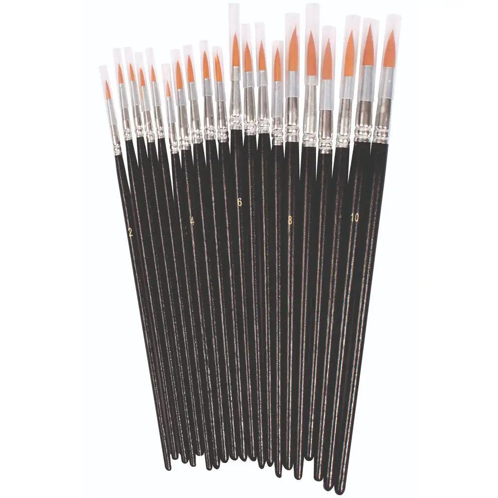 Acest set de 20 de pensule este fabricat din material sintetic de înaltă calitate și este o alegere excelentă pentru vopsele acrilice și ulei. Capetele rotunde ale pensulelor sunt plate și au mânere din lemn lăcuit, ceea ce asigură o prindere confortabilă și o manevrare ușoară.