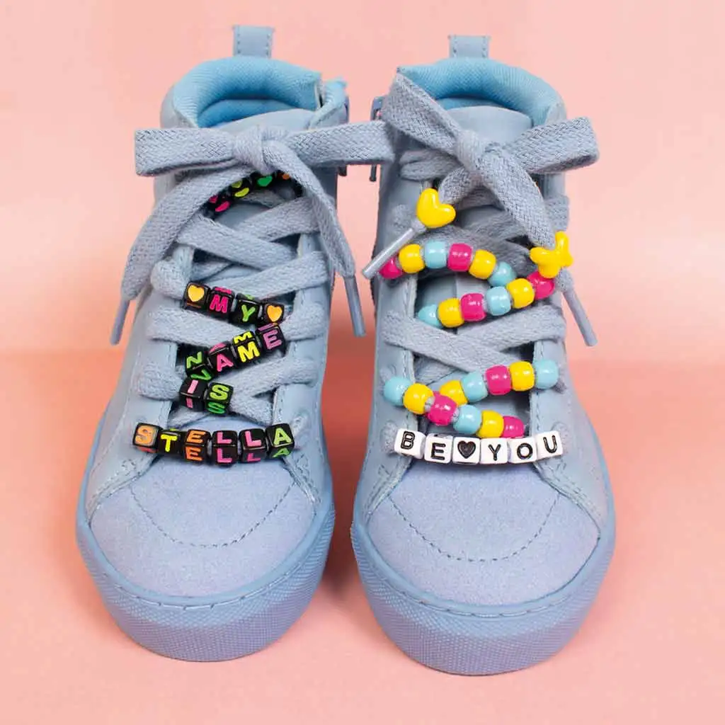 Găleata PlayBox plină de mărgele colorate care pot fi gătite este alegerea perfectă pentru copii, pentru a-și exprima individualitatea și creativitatea. Setul de 1200 de piese include mărgele de diferite forme și culori, oferind o libertate enormă în crearea modelelor și stilurilor. Copiii pot face brățări, coliere sau chiar le pot folosi în șireturile de la pantofi, așa cum se vede în imagine, pentru decorațiuni personalizate ale încălțămintei.