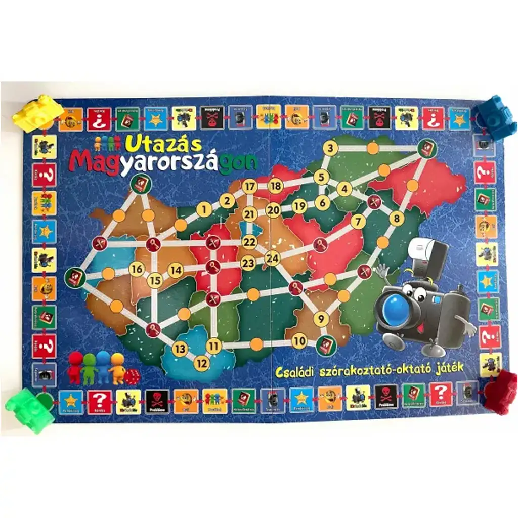 Tabla de joc colorată ilustrează harta Ungariei, cu diferite rute și stații prin care jucătorii pot călători. Pe parcurs, cărțile cu întrebări îi ajută pe jucători să-și extindă cunoștințele – în total, 60 de întrebări și 240 de răspunsuri așteaptă participanții, garantând că fiecare rundă va fi incitantă și unică. Temele sunt variate: geografie, obiective turistice, tradiții, persoane celebre și multe alte lucruri interesante.