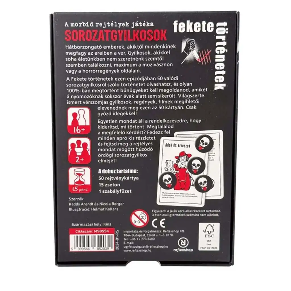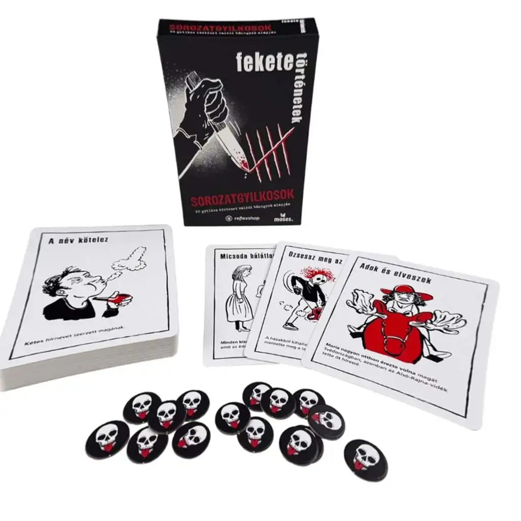 Black Stories: Criminali în serie nu este pentru oricine – dar dacă îţi place genul, te va acapara şi îl vei juca mereu şi mereu. Pregăteşte-te pentru poveştile celor mai cunoscuţi criminali ai lumii, intuiţii de detectiv şi râsete înspăimântătoare!