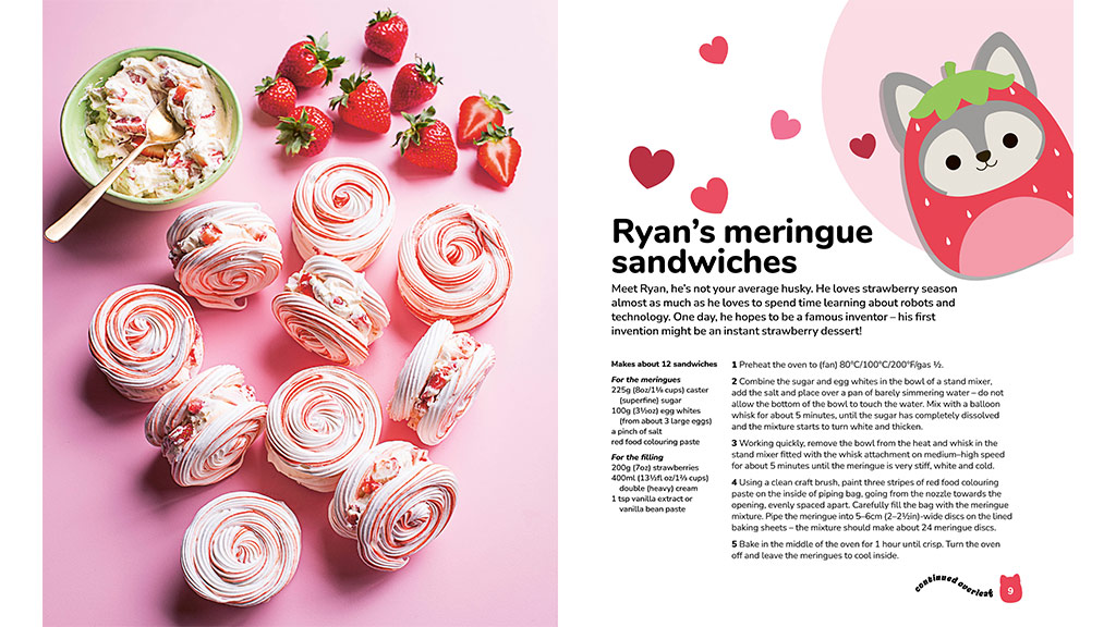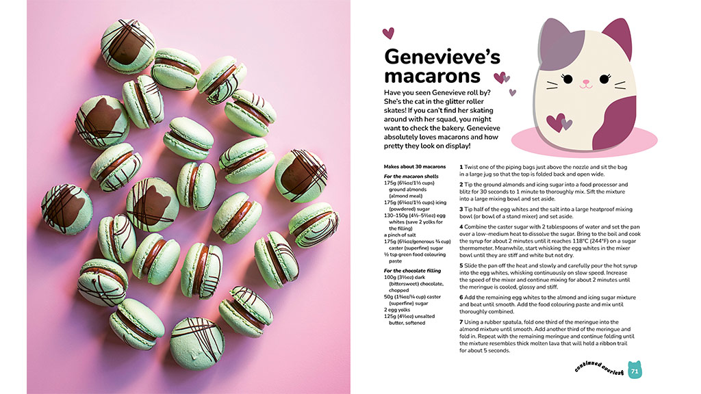 Squishmallows: Cartea oficială de copt conține 50 de rețete inspirate de Squishmallows, pe care copiii le pot pregăti împreună cu părinții lor. Printre rețete se numără produse de patiserie, torturi, biscuiți, bomboane și băuturi, pe care întreaga familie le poate prepara pe tot parcursul anului. Cartea este irezistibilă, deoarece conține fotografii delicioase ale tuturor rețetelor, care vor face copiii să le lase gura apă. Printre rețetele de top se numără prăjiturile tricolore ale lui Cam, trufele de ciocolată ale lui Hans cu decor de zahăr, melcii cu scorțișoară ai lui Lesedi, prăjiturile în formă de inimă ale lui Bethany, plăcintele whoopie cu dovleac și condimente ale lui Mac și multe altele!
