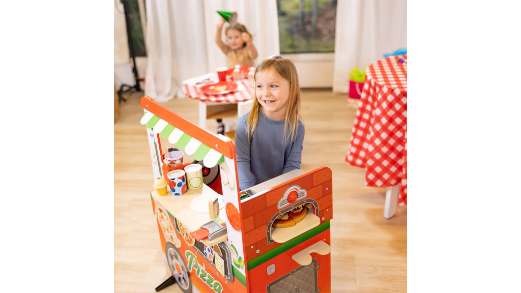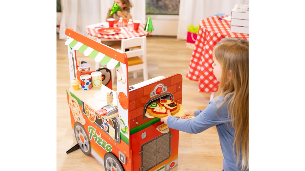 Melissa & Doug Pizza Food Truck din lemn este un set de joacă mare, cu 53 de piese. Copiii pot sta în spatele tejghelei din lemn și se pot juca de-a vânzătorii de pizza și înghețată, care sunt realizate din lemn, fetru și velcro. Centrul de joacă include un cornet de înghețată de jucărie, bile de înghețată de ciocolată și vanilie, un pahar, două recipiente de depozitare, o lingură și un dozator de înghețată.
