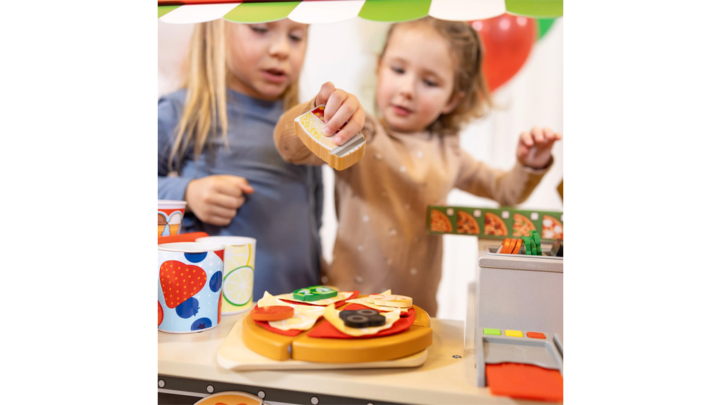 Setul de activități poate fi asamblat de o singură persoană, dar doi constructori ar putea fi cea mai bună alegere. Este necesară o șurubelniță cu cap în cruce, dar nu este inclusă, iar asamblarea poate fi consumatoare de timp. Părinții vor avea nevoie de un spațiu mare pentru construcție, iar din cauza greutății, probabil va deveni un loc de joacă fix.Bucătari începători; copii care iubesc jocurile de rol; cei mici care își dezvoltă abilitățile motorii fine; copii care învață cum să urmeze instrucțiuni verbale sau scrise; cei care caută jocuri senzoriale.Copiii își pot pregăti propria pizza imaginară în cuptorul inclus, cu felii de pizza din lemn și toppinguri din fetru, cum ar fi brânză, ciuperci și multe altele. Căruța de pizza funcționează și ca un cărucior de înghețată, cu bile de înghețată din lemn, un cornet, o lingură de înghețată și o ceașcă.