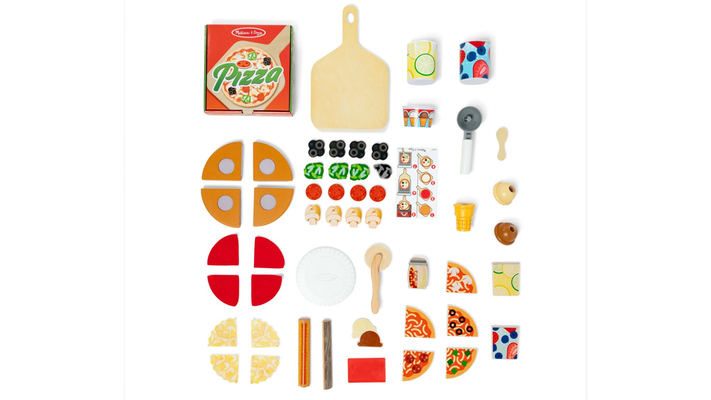 Acest joc conține o pizza de lemn cu sos de pâslă, brânză și toppinguri, cum ar fi pepperoni, măsline, ardei și ciuperci, pe care copiii le pot asambla cu ajutorul benzii de fixare inclusă. Accesoriile pentru pizza imaginară includ o spatulă de lemn, o cutie de transport din carton, un bloc ce reprezintă parmezan și fulgi de piper, un cititor de carduri și un card bancar de jucărie.