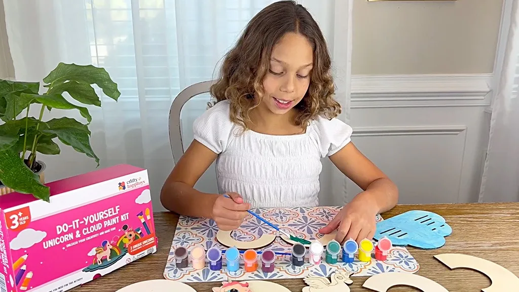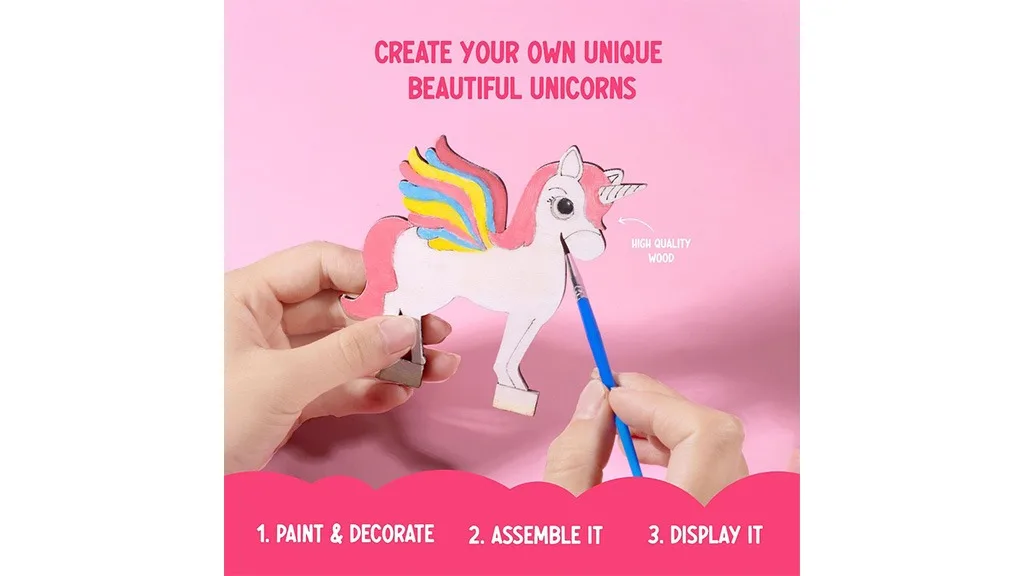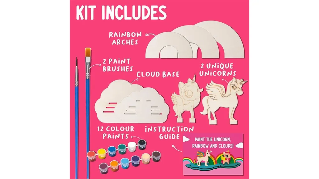 Acest set conține toate instrumentele necesare pentru ca copiii să creeze creații magice, inclusiv un dioramă cu unicorn, 12 vopsele non-toxice, și două pensule – una plată și una pentru detalii. Copiii pot decora unicornii lor și pot expune aceste drăguțe piese decorative cu acest set de pictură fără stres și fără ecran.