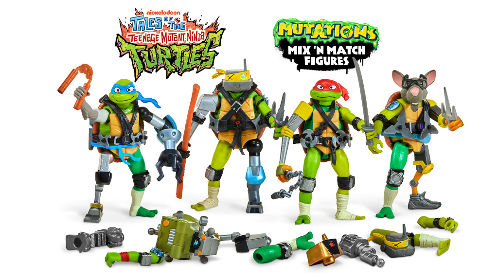 Copiii pot amesteca și potrivi elementele — inclusiv brațele, picioarele, capetele, armele și multe altele — între figurinele de acțiune ale personajelor din serialul TV Aventurile Țestoaselor Ninja. Fiecare figurină de 4,5 inci vine cu accesorii care pot fi îndepărtate și plasate pe alt personaj. Colecția include personajele Leonardo, Raffaello, Michelangelo, Donatello, Maestrul Splinter și Bishop.