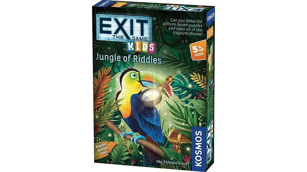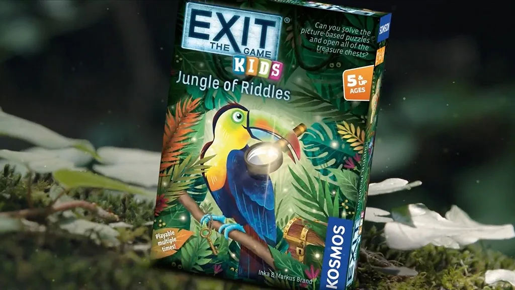 EXIT: Kids - Enigmele din Junglă le cere copiilor să rezolve puzzle-uri bazate pe imagini pentru a debloca cuferele de comori păzite de animale. Jocul include o foaie de răspunsuri, 36 de cărți de puzzle, nouă jetoane de cufere de comori, șase jetoane de chei și șapte obiecte ciudate. Jucătorii trebuie să tragă o carte de puzzle pentru fiecare culoare și să rezolve puzzle-urile individual. Dacă foaia de răspunsuri indică că soluția lor este corectă, copiii primesc un jeton de cheie pentru a deschide cufărul de comori. Aventura se încheie când jucătorii rezolvă cele șase puzzle-uri și își obțin comorile.