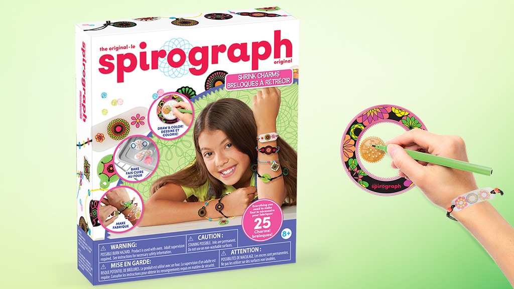 **Spirograph-ul Original de Farmece Micșorabile** combină distracția Spirograph-ului cu posibilitatea de a crea bijuterii unice. Copiii pot folosi modelele pre-făcute sau pot crea propriile opere de artă pe foile de plastic incluse, care se micșorează rapid în cuptor. Familiile pot urma modelele sau își pot folosi imaginația pentru a crea brățări, coliere și multe altele cu ajutorul șnururilor, mărgelelor și închizătorilor incluse.