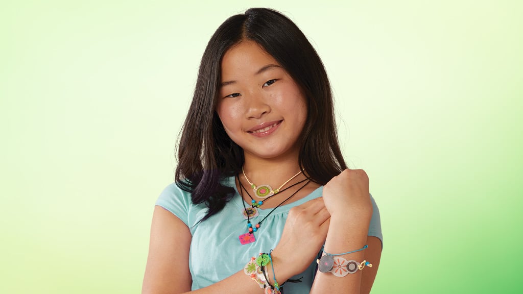 Acest set combină distracția Spirograph cu posibilitatea de a crea bijuterii unice. Folosește modele pre-făcute sau creează artă unică pe foile de plastic incluse, care se micșorează rapid în cuptor. Se pot realiza "25 de bijuterii" cu el.