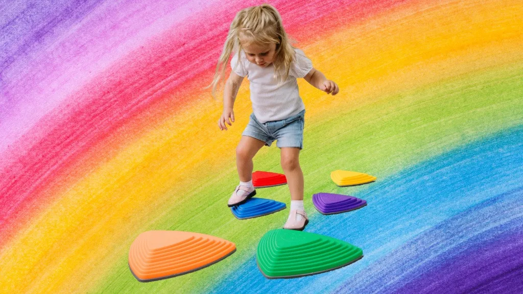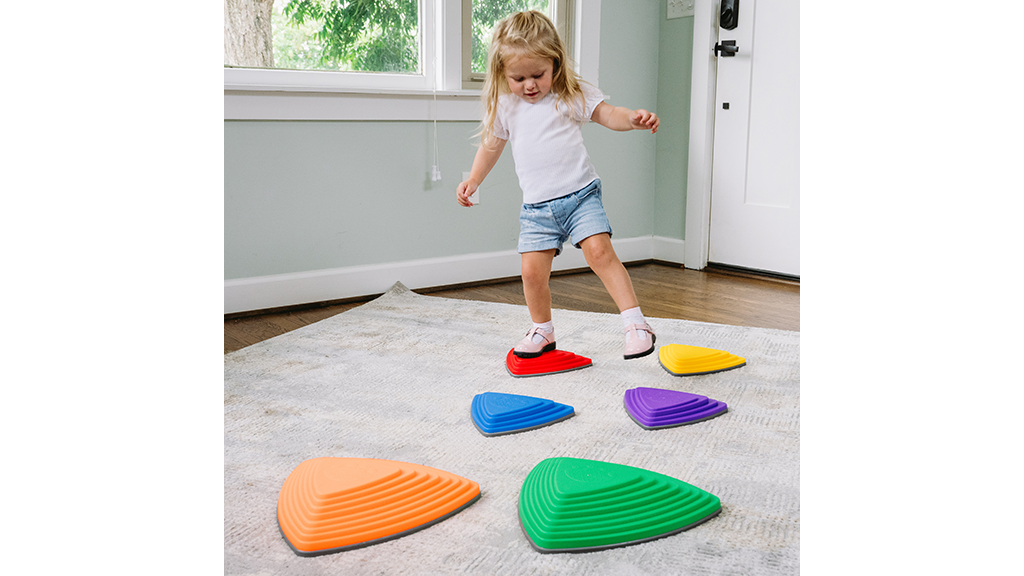 Acest set conține șase pietre de pas în culori vii, în două dimensiuni și culori moderne - galben, roșu, albastru deschis, verde, portocaliu și albastru închis. Fiecare piatră are o suprafață texturată și o bază cauciucată pentru o aderență sigură, astfel încât fiecare pas să fie sigur și plăcut. În plus, aceste pietre de pas sunt versatile, permițând copiilor să creeze diferite trasee pe care să meargă și să sară fără să atingă podeaua.