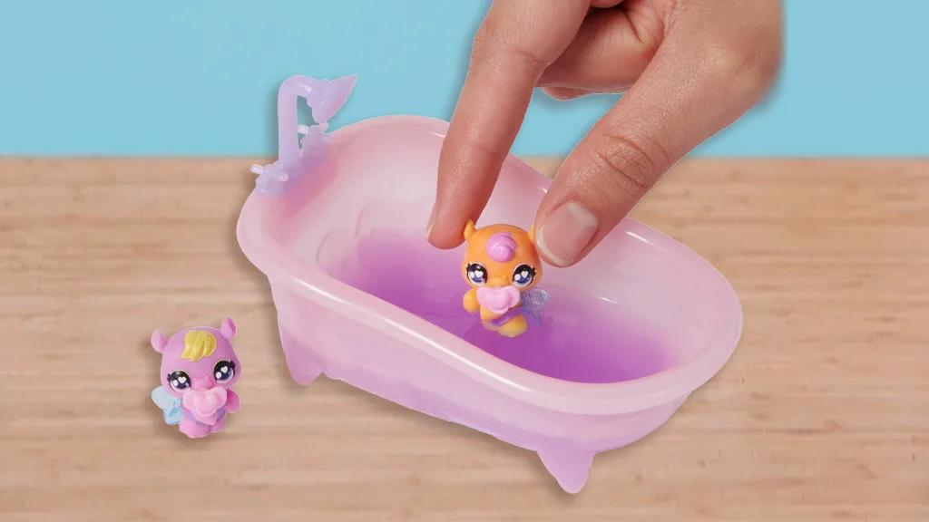 Descoperirea surprizei se termină într-o clipă, dar este o experiență magică, memorabilă, pe care copiii o vor adora. Jucăriile miniaturale sunt foarte populare, iar acest set de jocuri conține multe piese mici drăguțe cu care copiii pot să se joace. Apa sclipitoare este o adăugire frumoasă, și deoarece ouăle sunt roz și albastre, copiii pot amesteca vopselele în cadă pentru a obține culoarea violet! Un bonus distractiv: cada este de dimensiunea perfectă pentru o casă de păpuși.Acest set este plin de piese extrem de mici și este cel mai potrivit pentru gospodăriile cu copii mai mari.