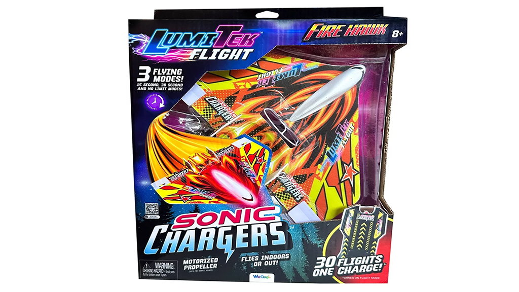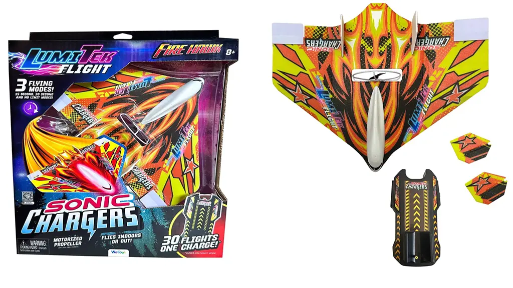 Copiii pot crea acrobații aeriene dinamice cu ajutorul Sonic Chargers Fire Hawk de la WeCool. Pot încărca Fire Hawk și pot zbura cu el în interior sau în exterior. Include trei moduri de zbor diferite, stabilizatoare verticale și un ghid care ajută la învățarea executării acrobațiilor.
