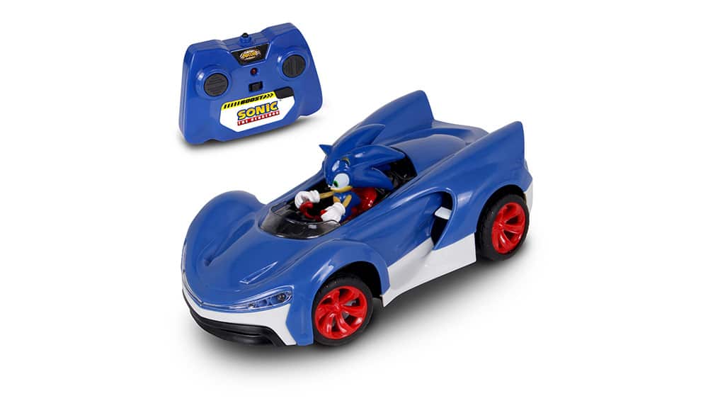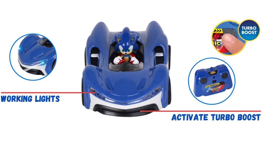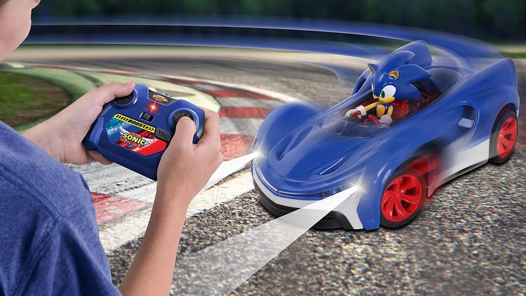 Fie că aleargă pe jos, fie că gonește cu mașina sa telecomandată, Sonic trebuie să fie mereu rapid. Această mașină telecomandată este echipată cu anvelope aderente și faruri LED funcționale. Designul special al vehiculului îi permite să se deplaseze cu ușurință pe cele mai dificile terenuri, astfel Sonic poate depăși orice obstacol. Viteza și aventura sunt garantate cu acest joc fantastic!