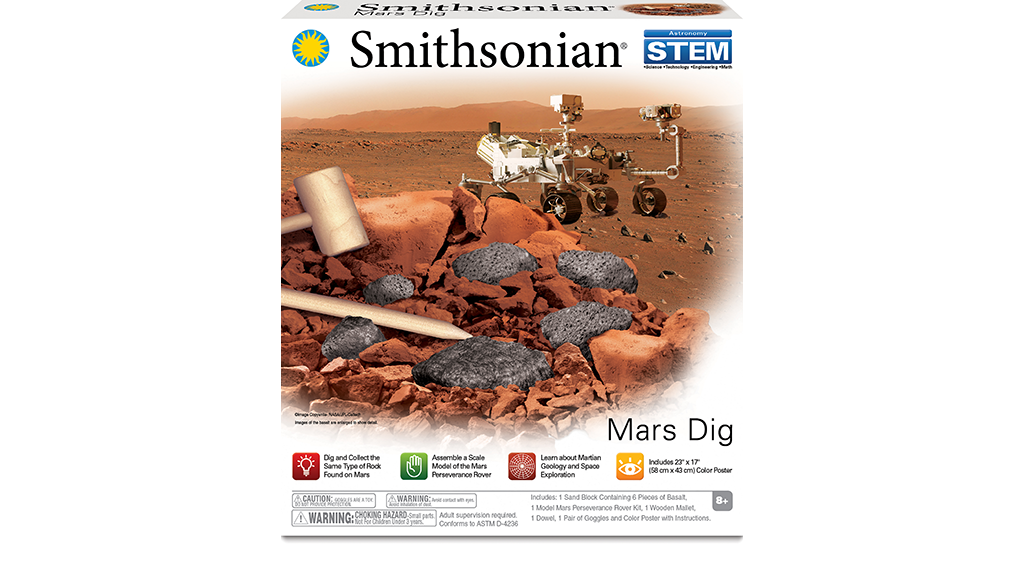 Smithsonian Mars Dig de la NSI International conține toate uneltele necesare pentru ca copiii să descopere roci care se pot găsi și pe Marte. Copiii de 8 ani și mai mari pot îndepărta nisipul dintr-un bloc pentru a descoperi șase bucăți de bazalt. De asemenea, pot asambla propriul lor model la scară al roverului Perseverance, care a colectat mostre de rocă pentru a fi aduse și studiate pe Pământ. Setul include și un poster, pe o parte cu multe informații, iar pe cealaltă parte cu instrucțiuni.Copiii învață numeroase concepte STEAM, cum ar fi geologia, explorarea spațială, astronomia și multe altele. Ei pot citi despre roverul Perseverance de pe Marte și despre importanța misiunii sale, în timp ce se familiarizează în mod practic și experiențial cu rocile și solurile de pe Marte. Asamblarea roverului este simplă și rapidă – piesele se fixează ușor la locul lor, iar copiii pot studia componentele și pot înțelege funcțiile lor. După ce „cercetarea științifică” (săparea rocilor) se încheie, copiii pot adăuga noile lor roci la colecția lor!