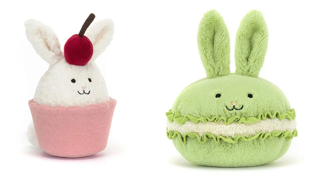 Noile plușuri Jellycat sunt atât de drăguțe, încât ai vrea să le mănânci! Aceste plușuri combină iepurași de Paște cu delicatese fine, inclusiv cupcake-uri și macaron-uri.