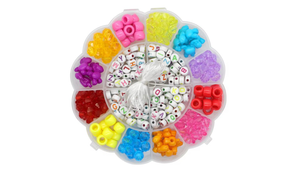 Set de mărgele colorate într-o cutie în formă de floare, acest set oferă 270 de piese diferite pentru proiecte creative de bijuterii pentru copii. De asemenea, include șnururi care permit diverse opțiuni de meșteșug, cum ar fi brățări, brățări de gleznă, coliere, precum și decorarea cardurilor și genților făcute manual.