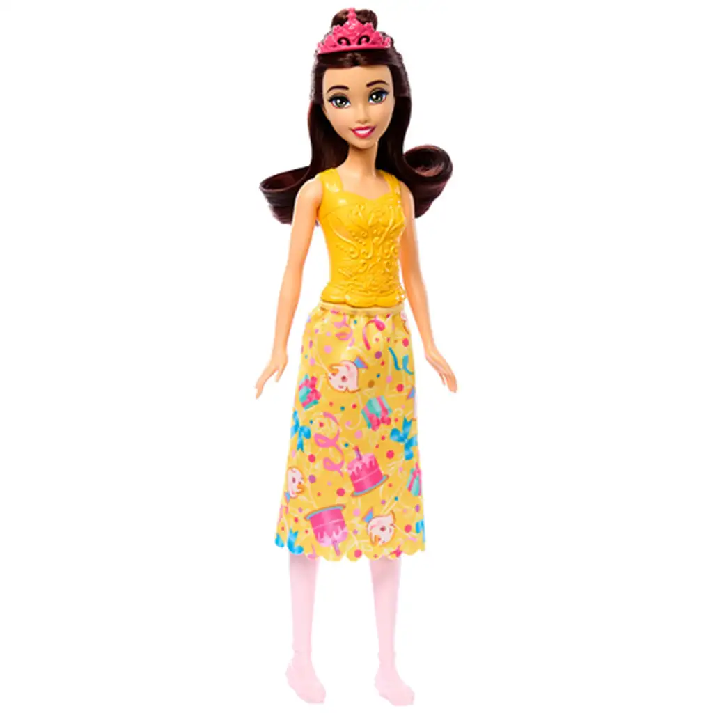 Belle strălucește într-un top iconic auriu, combinat cu o fustă viu colorată și imprimată. Pe fusta detașabilă se regăsesc detalii adorabile precum Ceșcuță (Chip), Doamna Potts, torturi festive, cutii de cadouri și confetti – astfel totul este pregătit pentru o adevărată petrecere Disney! Pe cap, păpușa poartă o tiară roz, iar părul ei lung și castaniu poate fi ușor pieptănat, oferind copiilor libertate să-l aranjeze după preferință.