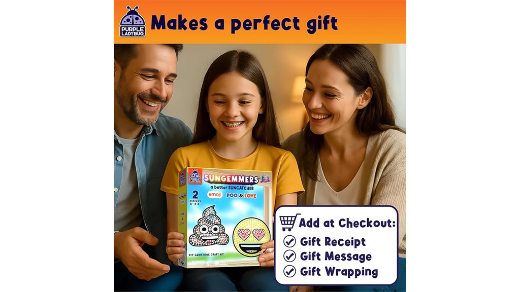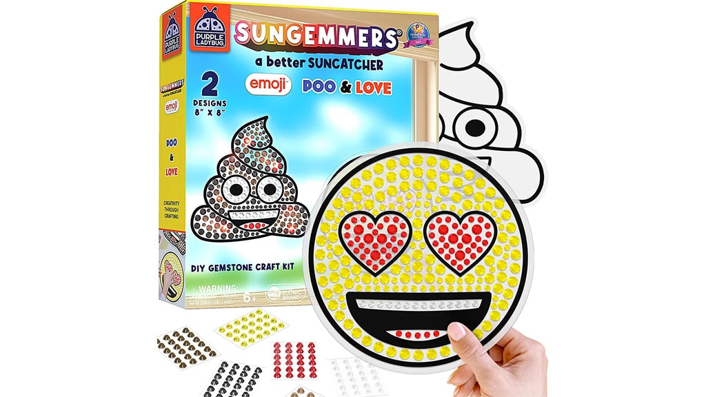 Emoji SunGemmers de la marca Purple Ladybug sunt seturi creative care le permit copiilor să creeze capcane de soare emoji vii și strălucitoare. Fiecare set conține modele emoji pretipărite, un ghid de culori, bandă adezivă și peste 1000 de autocolante cu pietre prețioase. Copiii pot urma modelul dat sau își pot lăsa imaginația liberă pentru a crea propriile combinații de culori. Creația finalizată poate fi lipită cu ușurință pe fereastră, unde, strălucind în lumina soarelui, aduce o atmosferă unică și veselie în orice cameră. Acest set nu doar dezvoltă creativitatea, ci oferă și distracție, în timp ce copiii își pot decora mediul cu propriile mâini.