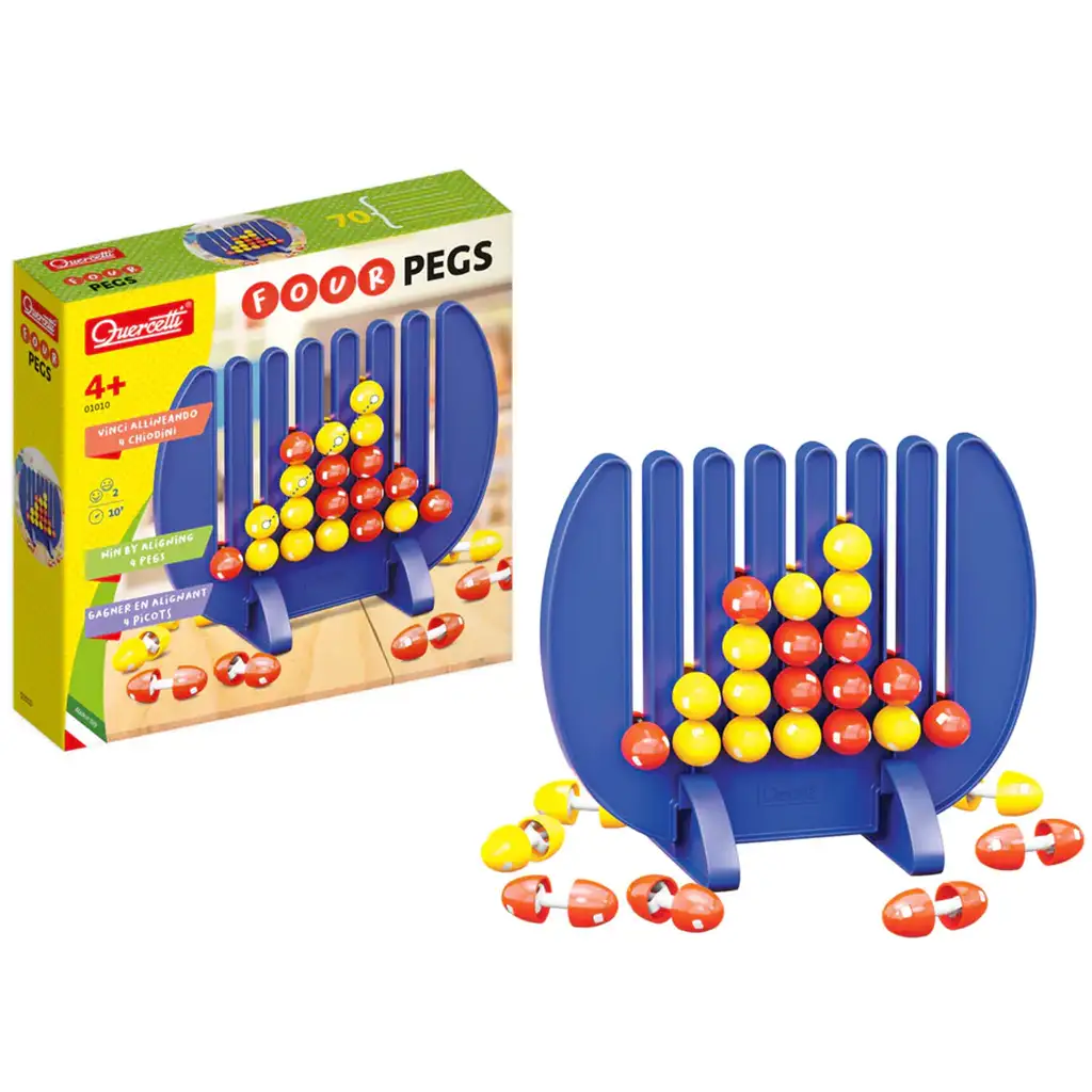 Jocul de societate Quercetti Patru la Rând oferă o experiență de joc captivantă și distractivă pentru întreaga familie. Baza jocului este un suport albastru asemănător unui „pieptene”, în ale cărui dinți jucătorii pot introduce micile piese. Aceste piese sunt vizibile clar de ambele părți și pot fi plasate în siguranță pe tablă, astfel încât să nu cadă.
