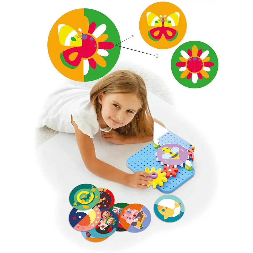 Acest joc este recomandat în special copiilor cu vârsta de peste 4 ani, deoarece este ușor de asamblat, dar oferă multe oportunități de explorare. Aranjarea corectă a roților dințate și punerea lor în mișcare ajută la dezvoltarea abilităților logice, în timp ce utilizarea oglinzii oferă o nouă perspectivă asupra percepției spațiale pentru cei mici. Culorile vii și modelele drăguțe ale jocului îl fac și mai atrăgător pentru copii, garantând că le va capta atenția pentru mult timp.