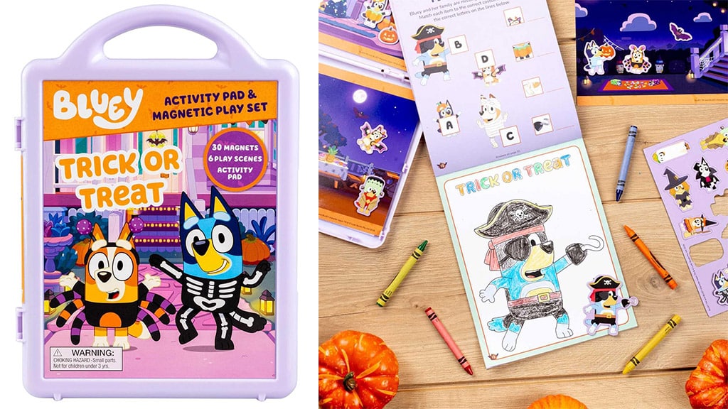 Acest set conține 30 de piese magnetice cu care se poate juca. Aceste piese reprezintă forme și culori diferite, astfel încât dezvoltă creativitatea și abilitățile motorii fine ale copiilor. Elementele magnetice pot fi ușor atașate și îndepărtate, astfel jocul este atât distractiv, cât și educativ în același timp. Este o alegere ideală pentru activități acasă sau chiar în timpul călătoriilor.Chiar și cei mici pot trăi atmosfera de Halloween cu cartea cu clapete „Cartea lucrurilor înfricoșătoare a lui Bluey și Bingo”, în care cei doi frați descoperă surprize palpitante, dar nu prea înfricoșătoare, în jurul casei – de exemplu, insecte târâtoare în piscină sau cercuri misterioase de dans. Această carte îi ajută pe copii, într-un mod jucăuș, să își cunoască și să își depășească temerile, în timp ce se pot distra împreună cu familia. Pentru copiii mai mari sunt disponibile cărți de colorat și caiete de activități magnetice, care oferă zeci de jocuri interactive, labirinturi și activități festive, astfel încât fiecare să își poată găsi ocupația preferată în acest sezon plin de fiori.