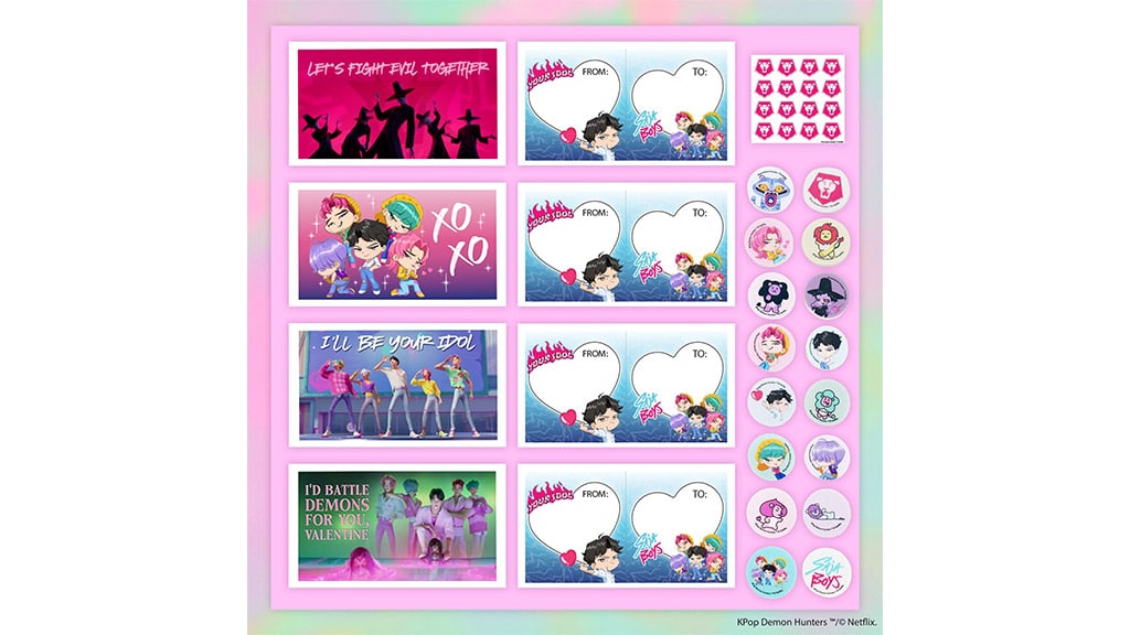 Anul acesta, de Ziua Îndrăgostiților, copiii își pot împărtăși pasiunea pentru trupele lor preferate cu felicitări tematice K-Pop Demonvadászok. Aceste pachete sunt disponibile în două stiluri, HUNTR/X și Saja Boys, și conțin 16 felicitări pliante cu mesaje drăguțe de Valentine’s Day, perfecte pentru micii fani. În pachet se găsesc și autocolante în formă de baghetă luminoasă, precum și autocolante 3D mobile, astfel încât aceste cadouri devin cu adevărat speciale și memorabile pentru orice copil care iubește lumea K-pop.