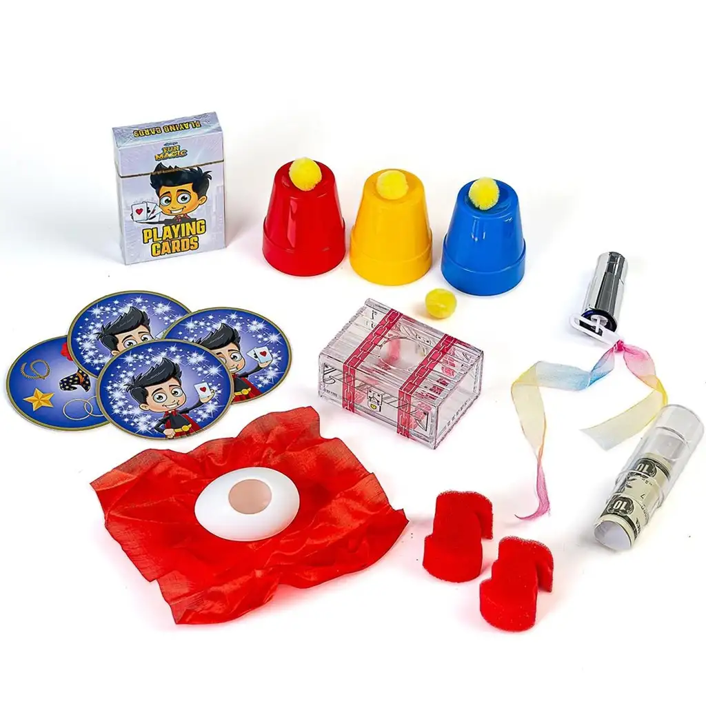Setul conține recuzita necesară pentru mai multe trucuri de magie clasice: trucul cu pahare colorate, tubul magic pentru bani, zarul secret, batista care dispare, pachet de cărți, lada misterioasă transparentă, discuri pentru spectacol și o batistă de mătase pentru trucul cu ou. Jocul conține și un cod QR cu ajutorul căruia poți accesa tutoriale video online prezentate pas cu pas – astfel copilul tău poate învăța cu ușurință să execute trucurile.